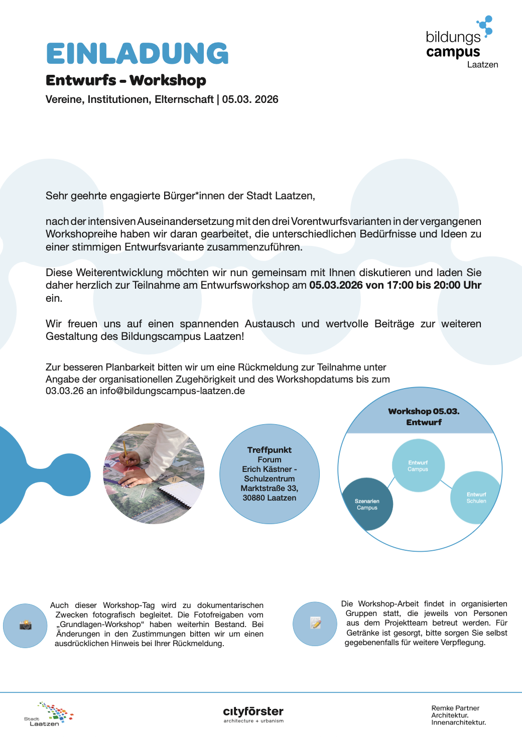 Daher laden wir Sie herzlich zur nächsten Workshoprunde „Entwurf“ am 05.03.2026 um 17:00 Uhr im Erich Kästner-Schulzentrum ein. Zur besseren Planbarkeit bitten wir um eine Rückmeldung zur Teilnahme an die Adresse info@bildungscampus-laatzen.de, gerne unter Angabe des Workshop-Datums sowie der persönlichen Zugehörigkeit (Verein, Elternschaft, etc.).